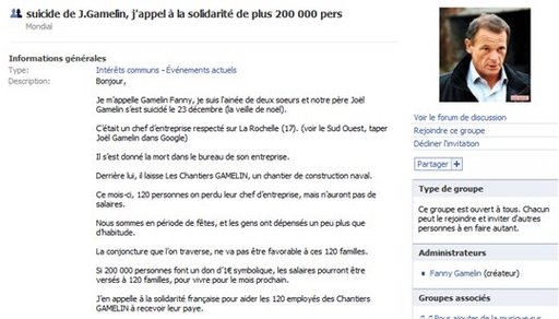 Vous avez sans doute entendu parler du groupe sur Facebook ouvert par Fanny Gamelin, qui souhaitent pouvoir donner les salaires aux 120 ouvriers de l'entreprise Gamelin, dont le créateur, son père, s'est donné la mort le 23 décembre dernier en voyant que son entreprise était fichue et qu'il ne pourrait pas payer les salaires.