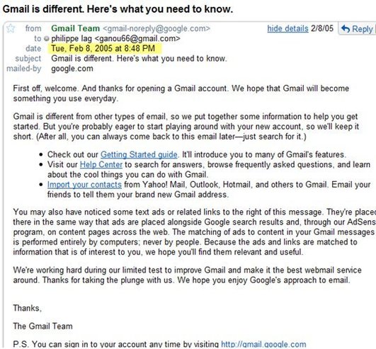 Et vous, votre premier mail sous Gmail, c'était quand ?