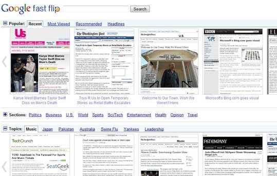 Google vient de mettre en ligne Google Fast Flip qui est un genre d'agrégateur de news réalisé à partir de de screen de journaux papiers.