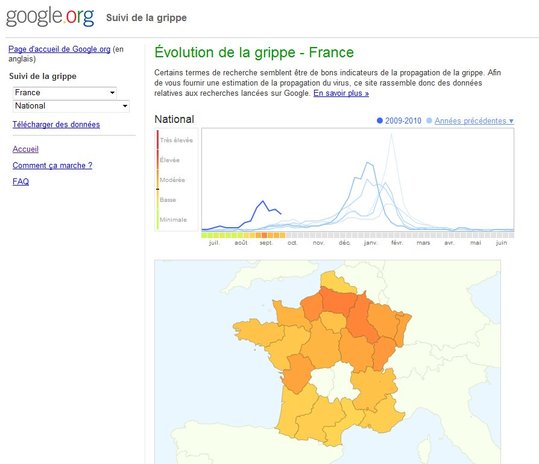 « Certains termes de recherche semblent être de bons indicateurs de la propagation de la grippe. Afin de vous fournir une estimation de la propagation du virus, ce site rassemble donc des données relatives aux recherches lancées sur Google »