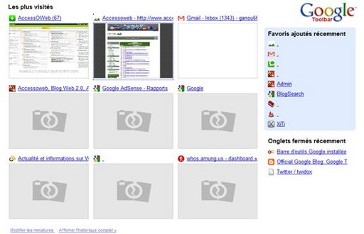 La dernière version de Google Toolbar, permet, lors de l'ouverture d'un nouvel onglet sur Firefox, d'afficher les sites que vous ouvrez souvent ainsi que les derniers favoris que vous avez ajouté.