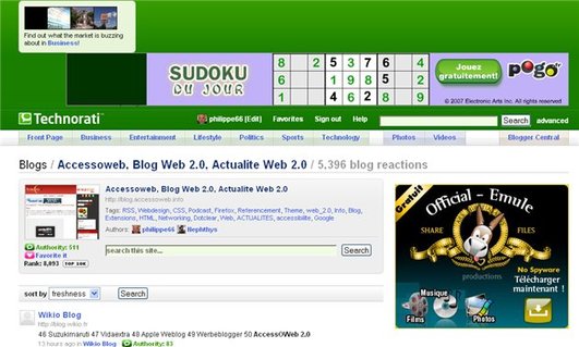 L'image ci-dessus correspond à l'intégralité la page de Technorati sur mon écran 15 pouces.