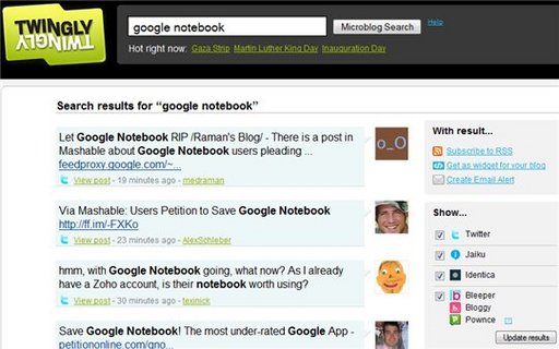 Actuellement, Twingly effectue les recherches sur Twitter, Jaïku (qui risque de pas vivre bien longtemps), Pownce (du moins dans ces archives), identi.ca, Blepper et Bloggy.