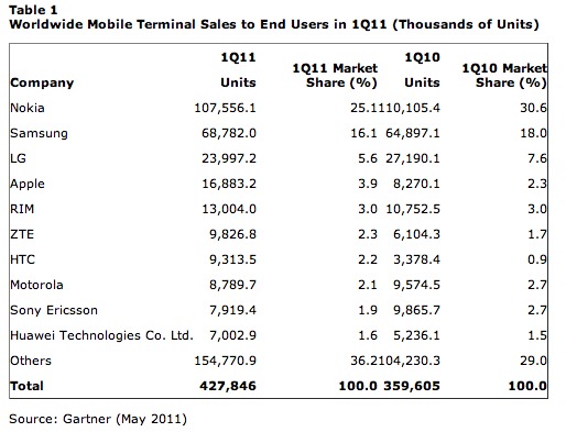428 millions de mobiles ont été vendus dans le monde au cours du 1er trimestre 2011 selon une étude de Gartner.