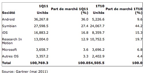 Android crève l'écran avec plus de 36 millions d'unités vendus dans le monde au cours de ce 1er trimestre, ce qui représente 36% de parts de marché. Incroyable, une progression de près de 700 %.
