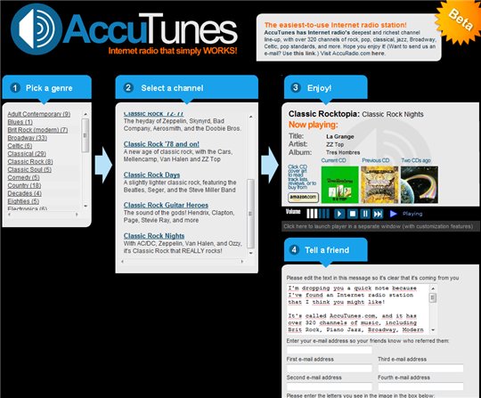 AccuTunes se qualifie comme Radio du Web mais je dirais plutôt que cela ressemble à de grosses playlist selon des catégories bien définies que vous pouvez écouter à volonté.