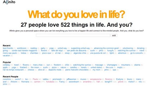 Le principe d'Afinito est simple, vous vous créez un compte, vous notez ce que vous aimez dans la vie. Lorsque vous ajouterez un mot ( ou TAG ) nouveau, vous devrez lui donner une description afin que d'autres personnes puissent s'en servir dans le cas ou ces personnes aiment les mêmes choses que vous.