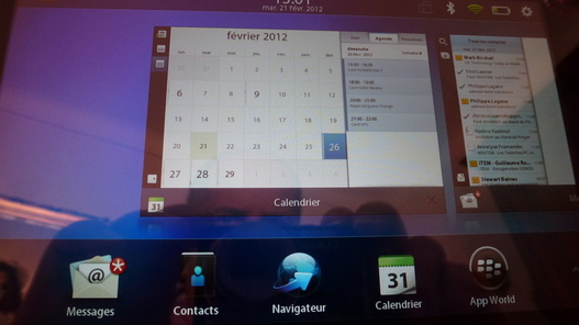 Maintenant donc, comme vous pouvez le voir sur l'image ci-dessus, les applications Mail, Contacts et Agenda prennent la place d'honneur au démarrage de la tablette. D'ailleurs, le système de menu de la Playbook a maintenant quelque peu évoluer avec l'OS 2.0, on retrouve un menu unique à plusieurs pages plutôt que les différents menus précédents (différents onglets)