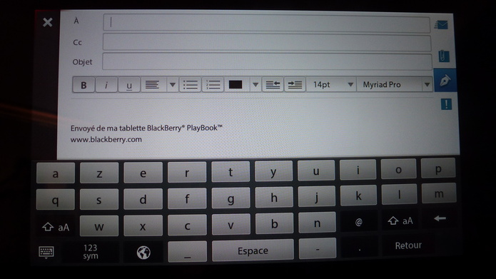 Pour la fonction Mail, on peut gérer plusieurs compte sur la Playbook, j'ai actuellement synchronisé uniquement une adresse mail Gmail et voici l'interface que l'on retrouve lors de l'écriture d'un mail