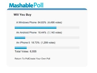 Voici ces résultats. D'abord Mashable avec près de 65 % des votes pour un Windows Phone