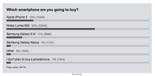 Les sites Mashable, The Verge et Wired ont tous trois réalisé un sondage auprès de leurs lecteurs afin de savoir quels mobiles ils pensaient acheter pour cette fin d'année. Les résultats sont sans appel, Windows Phone et le Nokia Lumia 920 sont réellement en tête des sondages.