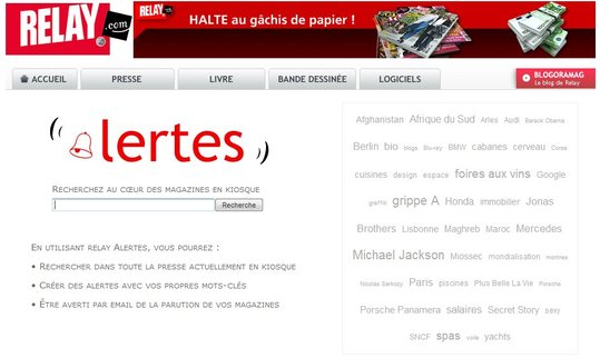 En clair, vous tapez des mots, ou des combinaisons de mots, et Alertes Presse de Relay vous sort tous les magazines dans lesquels votre recherche se trouve.