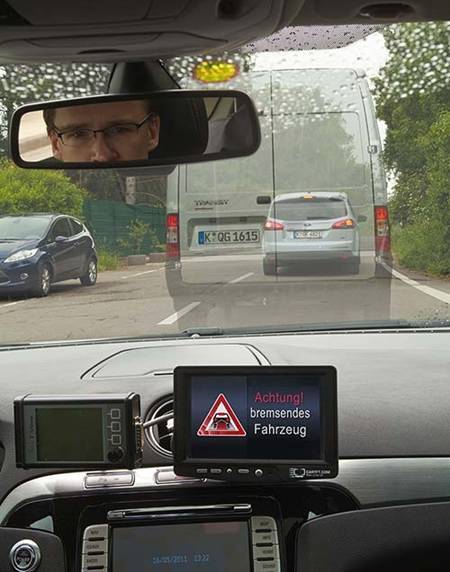 - Le feu stop électronique, qui transmet un message du véhicule de tête à un véhicule suiveur en cas de freinage d’urgence, même si l’incident se déroule hors de vue, en virage par exemple. Ford dirige le développement et l'intégration de cette application.