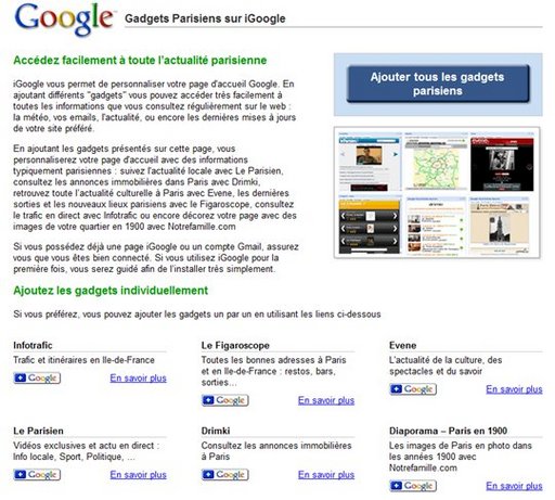 Google, en partenariat avec Le Figaro, Le Parisien, Info Traffic, Notrefamille.com et Kreative Technologies ont a lancé un onglet spécial Paris dans iGoogle.