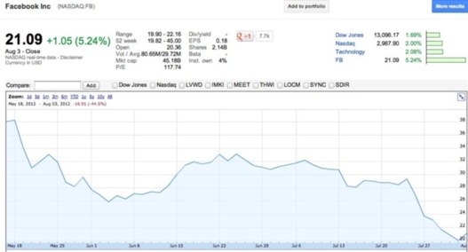 Mais revenons à l'action de Facebook qui dégringole à vitesse grand V depuis son introduction le 18 Mai 2012.
