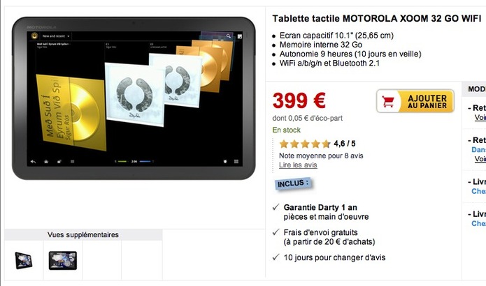 Après la Blackberry Playbook qui subit une baisse aux US de 150$, c'est au tour de la Motorola Xoom de passer au pressoir pour voir le prix de la Xoom 32 Go WIFI passé à 399 € en France et notamment chez Darty.