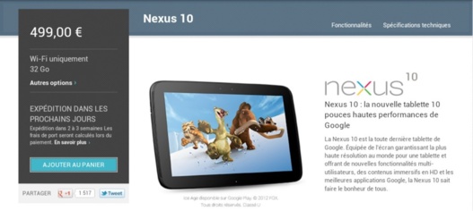 La Nexus 10 est disponible en version 16Go (399€) ou en version 32Go (499€) toutes deux wifi et déjà sur le système Android 4.2 JellyBean.