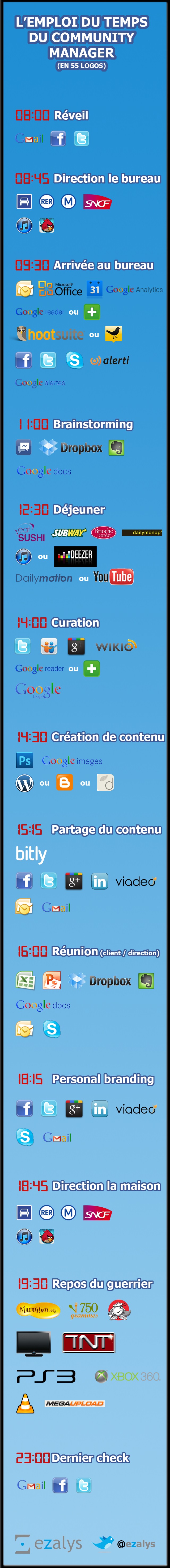 Voilà une infographie qui devrait plaire aux Community Manager puisqu'elle retrace l'emploi du temps d'un CM. Je ne sais pas si c'est respecté en tout point, mais on doit pas être bien loin de la vérité :) A vous de nous le dire.