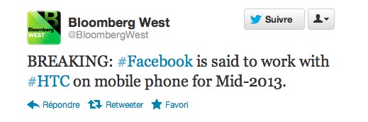 Du coup, le Facebook Phone, du moins un mobile HTC entièrement consacré à Facebook sera commercialisé à la mi 2013 selon Bloomberg.