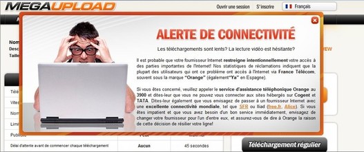 Si vous êtes chez Orange, vous avez surement remarqué de grosses lenteurs de connexion sur certains sites notamment sur MegaUpload. Ce dernier le notifie maintenant aux abonnés de l'opérateur historique, si vous vous rendez sur le site, une pop-up vous invite clairement à aller voir ailleurs par exemple chez SFR, Free ou Alice qui ne rencontraient pas ces soucis sauf en soirée où il y a beaucoup de trafic.