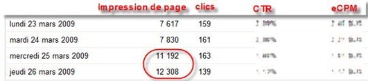 Mais là n'est pas le problème. Comme vous pouvez le constater, il y a une différence importante d'impressions de pages entre les 2 premiers jours ( qui ressemble à touts les autres du début du mois ) et les 2 derniers jours.