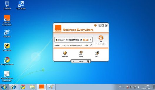 C'est la branche Orange Business qui propose ce netbook avec plusieurs forfaits destinés aux professionnels qui ne peuvent pas se contenter d'un hotspot Wifi. Premier point très agréable, l'utilitaire de connexion est déjà pré-installé dans la machine, souvent pour configurer une box par exemple il faut installer le soft qui est sur le cd. Une fois le logiciel Business Everywhere lancé, vous pouvez sélectionner la connexion de votre choix ,Wifi ou 3G+ (si la zone de couverture le permet). Ensuite vous avez un menu "classique" avec des raccourcis vous proposant d'aller sur internet, de consulter vos mails et d'envoyer un SMS. Une option d'alerte est intégrée au logiciel vous indiquant quand vous arrivez à la limite de votre forfait si vous n'avez pas souscris à l'option illimitée.