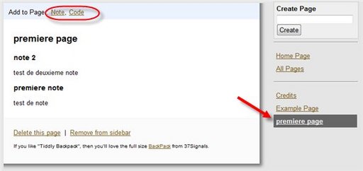 En fait Tiddly Backpack est un fichier à télécharger ( 20 Kb ), en HTML, qui s'ouvre sur votre navigateur et vous permet de créer des pages, d'insérer des notes dans ces pages et même d'y insérer du code qui sera mis en évidence ( vert sur fond noir ) automatiquement.