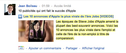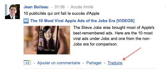 Une fois que vous aurez installé Google Translate for Google+, vous rafraichissez Google+ et vous verrez apparaître un bouton "traduire" en bas des posts, comme ceci