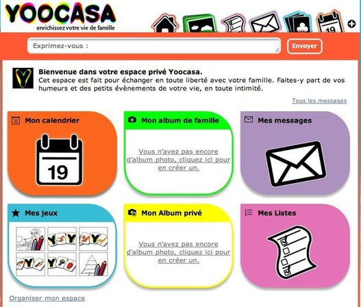 Yoocasa, qui vient d'entrer en phase Beta ( invitations à la fin de ce billet ) est un espace réservé à la famille, ou amis proches j'aurais envie de dire, qui va permettre de partager tout un tas de choses de façon très privée, voir même surveillée.