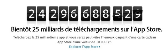 Bientôt 25 milliards d'applications téléchargées sur l'App Store d'Apple et à cette occasion, Apple propose de jouer pour gagner la somme de 10000 $ en bon d'achat sur l'App Store.