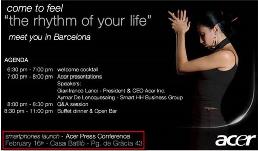 unWired View nous apprend que lors du MWC de Barcelone et plus précisément le 16 février, ACER devrait annoncer la sortie d'1 ou plusieurs smartphones.