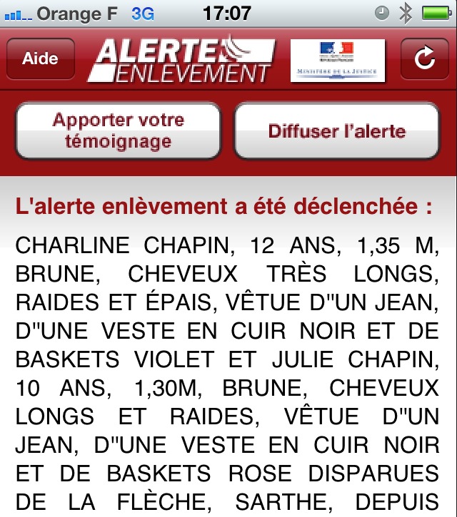 Si vous possédez un smartphone de type iPhone, Blackberry ou Android, il me semble important de vous inciter à installer l'application Alerte Enlèvement que vous trouverez sur les Store correspondants.