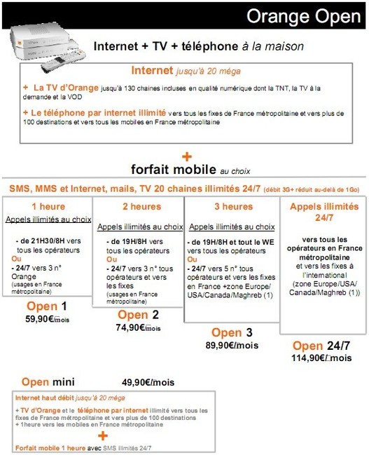 Avec l'évolution de son forfait Open 24/7, Orange est "le premier opérateur à proposer une offre de quadruple play avec de l’illimité vers tous les mobiles à la fois depuis une box et depuis le mobile", mais l'exclusivité se paye cher chez l'opérateur historique avec un tarif à 114.90€ par mois sur 2 ans.