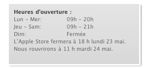Comme vous le voyez, les Apple Store fermeront leurs portes lundi 23 mai à 18h pour ne les ré ouvrir que mardi 24 mai à 11h. (vu sur Mac4Ever )