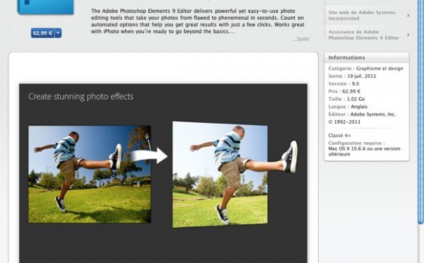 Adobe et l'App Store ne font plus qu'un avec la présence d'Adobe Photoshop Elements 9 Editor pour 62.99 €. C'est une version light de Elements 9 à qui on a retiré l'organiseur de photo mais iPhoto est une bonne alternative. Il faut savoir qu'Elements "standard" est vendu 99€ alors que cette version est cédé à 63 €...
