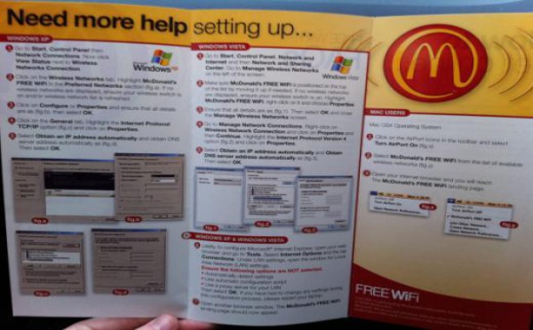 La chaine de fastfood américaine a publié un guide pour se connecter à leurs hotspots gratuits en expliquant pas à pas la méthode pour chaque système d''exploitation à savoir pour PC et Mac. Mais comme la photo parle d''elle même, il semblerait qu''une bonne pub soit faite pour la firme de Cupertino. Source