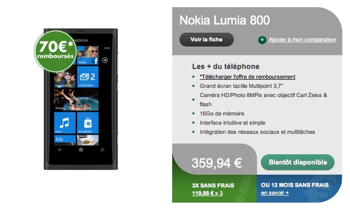 Le Nokia Lumia 800 (voir notre test ) bénéficie d'une baisse de 51 € que vous pouvez associé à une offre de remboursement de 70 € jusqu'au 18 mars ce qui vous met le Lumia 800 à 290 €.