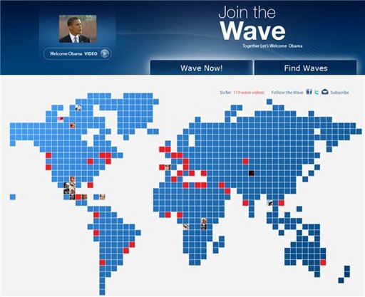 C'est le cas pour Join The Wave , site édité par Pixman Média Nomade, qui propose aux internautes du monde entier de dire un mot à Barack Obama sous forme de vidéo. Cette vidéo sera uploadée sur le site en précisant votre pays, ou ville le cas le cas échéant et sera donc visible sur cette mappemonde.