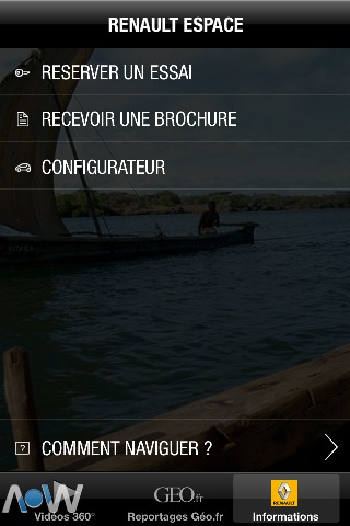 En dehors de ce mode "Vidéos 360°", vous pouvez lire des reportages réalisés par Géo.fr et aussi réserver un essai, recevoir une brochure ou encoreconfigurer selon vos besoins ce nouveau Renault Espace.
