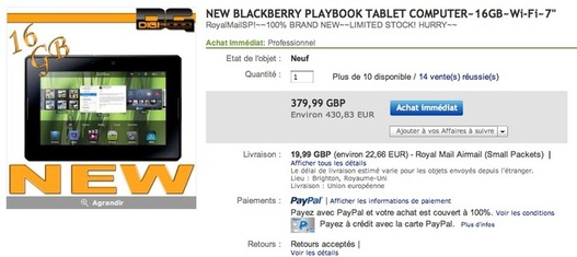 La tablette de RIM, la Blackberry Playbook, est attendue en France d'ici fin Avril mais, si vous en voulez une tout de suite, il est possible de la commander sur eBay pour 430 € en ajoutant 22 € de frais de port.