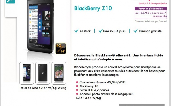 Le Blackberry Z10 est maintenant en vente en France et ça commence chez Orange et SOSH par la même occasion. Chez SOSH, vous trouverez le Blackberry Z10 au prix de 539 € mais vous trouverez aussi une ODR de 50 € ce qui ramènera le prix de votre terminal à 489 €. SOSH vous propose de payer le Blackberry en 4 fois sans...