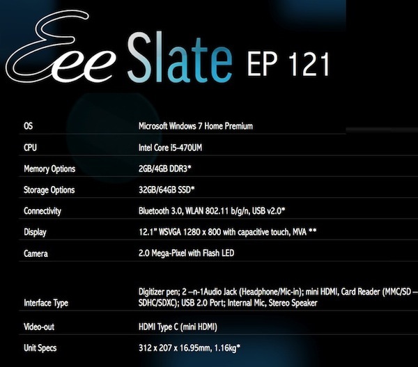 C'est à l'occasion de ce CES que Asus a annoncé sa tablette Eee Slate Ep 121. Contrairement à ce que l'on peut voir aujourd'hui, cette tablette ne tourne pas sous Android mais sous Windows 7 Home Premium.