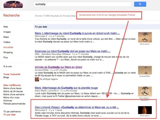 J'en tiens pour preuve un article de 20minutes.fr (image ci-dessous) qui a déjà référencé un article annonçant que Curiosity s'est pos sur Mars à 7h31 comme prévu (article évidemment non publié à l'heure ou j'écris cet article)... et cet article je l'ai repéré à 5h du matin ce lundi soit 2h30 avant que Curiosity ne touche le sol de Mars. (atterissage que vous pouvez voir en direct ici )