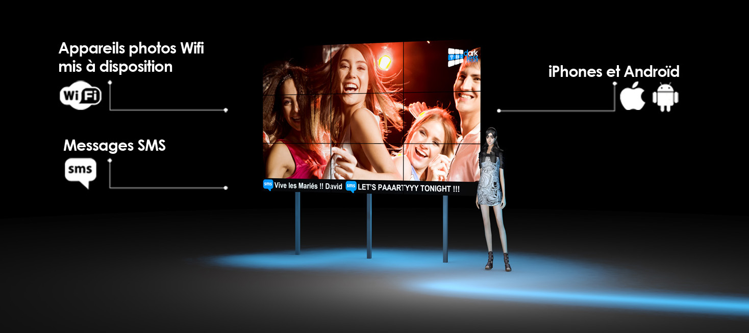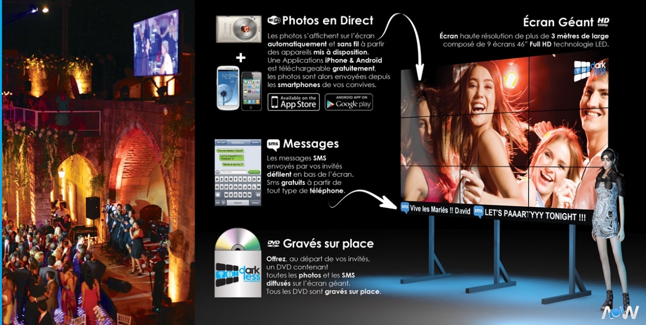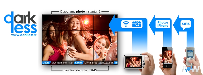 Darkless propose quelque chose de différent de ce que l'on peut voir habituellement. Ce concept se démarque par la diffusion en direct de photos prises par les invités ainsi que des SMS sur un écran géant composé de 9 écrans de 46 pouces.