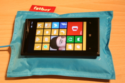 A l'intérieur, on découvre bien entendu le téléphone, l'accessoire pour ouvrir le slot micro-SIM, les manuels d'utilisateur et des écouteurs dont la qualité acoustique et l'ergonomie sont bluffantes. On est en effet bien loin des horribles écouteurs du Lumia 800... Du côté du coussin Fatboy, j'y reviendrai dans un prochain article, c'est en réalité un rechargeur Nokia DT 900 qu'on a mis dans une housse colorée estampillée "Fatboy"...