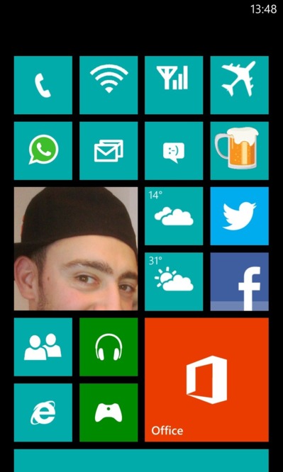 Nous avons très rapidement parlé du matériel, passons désormais à l'OS. Après avoir configuré son compte microsoft (nouvelle dénomination de l'identifiant hotmail/live/outlook/msn), vous arrivez à l'écran d'accueil composé de tuiles de trois tailles différentes, contre deux seulement sur WP7.5.