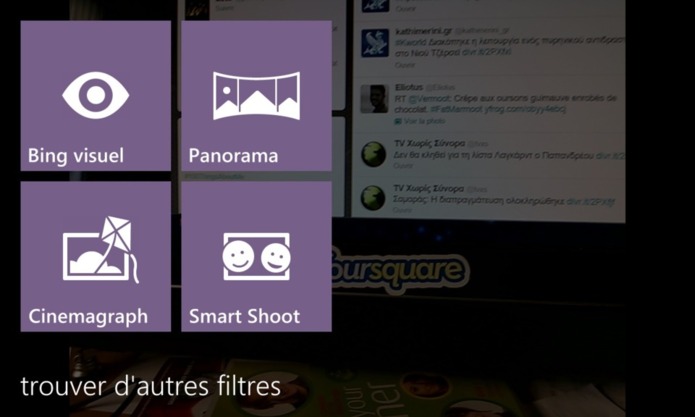 L'ajout de "lentilles" à l'appareil photo de Windows Phone 8 permettent d'augmenter l'expérience photographique de l'OS. Nokia a rajouté 3 lentilles: panorama, cinemagraph et smart shoot. On peut accéder à ces lentilles depuis l'appareil photo ou les lancer comme des applications.