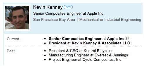 Apple a recruté un ingénieur dans le domaine des matériaux composites, Kevin Kenney, Patron de Kestral Bike, spécialiste des cadres de vélo en carbone.