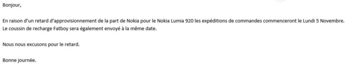 Voici le mail que j'ai reçu il y a quelques minutes dans ma boîte venant de Phonehouse. Les livraisons des précommandes du Lumia 920 ne s'effectueront qu'après le 5 novembre.