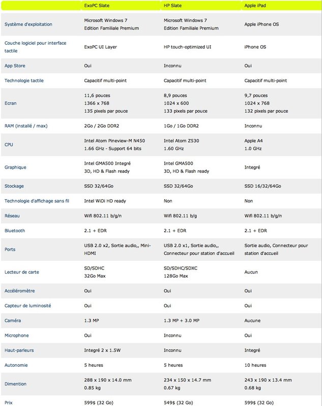 Avant d'en dire plus, voilà le comparatif de l'ExoPC et de l'iPad avec les nouveautés de l'ExoPC